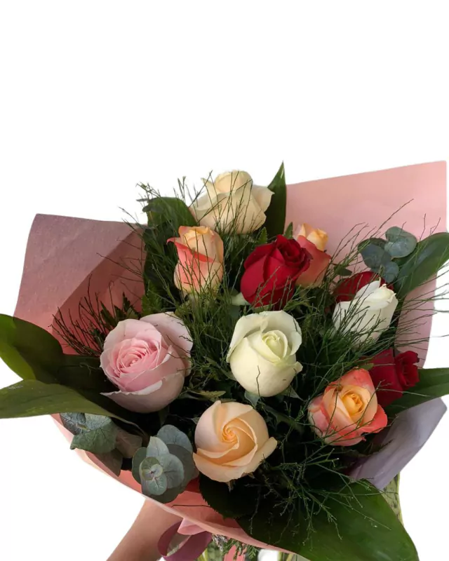 Buquê 12 Rosas Cores Sortidas com Complementos Verdes da Estação.
