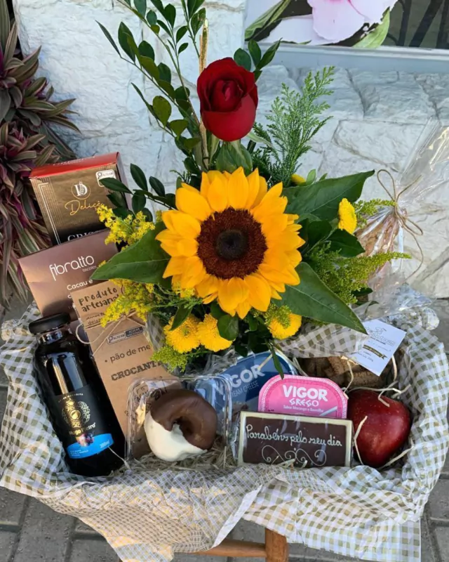 A Cesta Império é uma cesta de café com produtos mais selecionados e artesanais que acompanha arranjo de Girassol e Rosa.