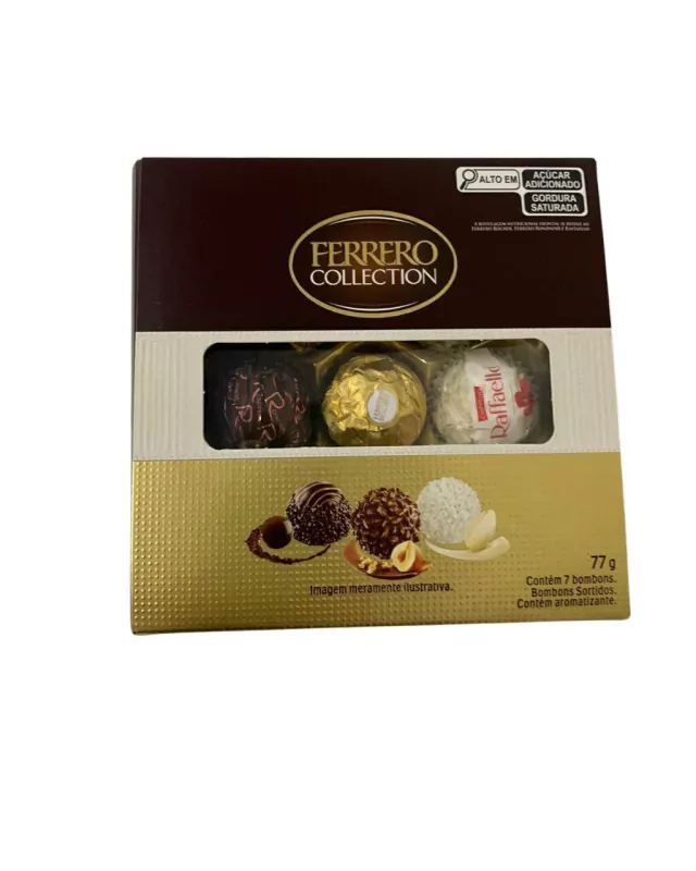 Caixa de Bombons composta por Raffaello, Ferrero Rocher Tradicional e Ferrero Rondnoir com 77g.